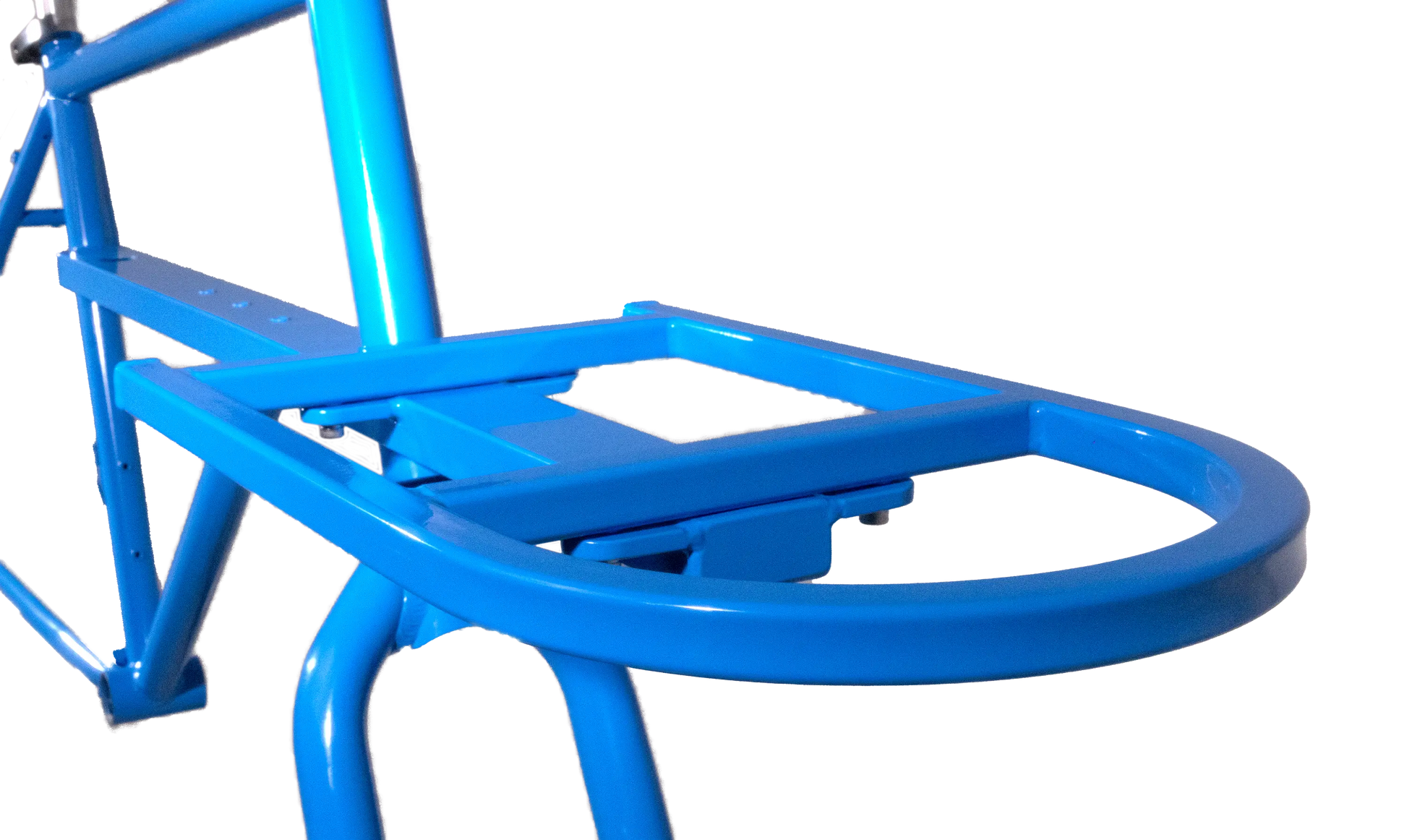 - Welded steel front rack (bolts to frame at 4 points for added strength)